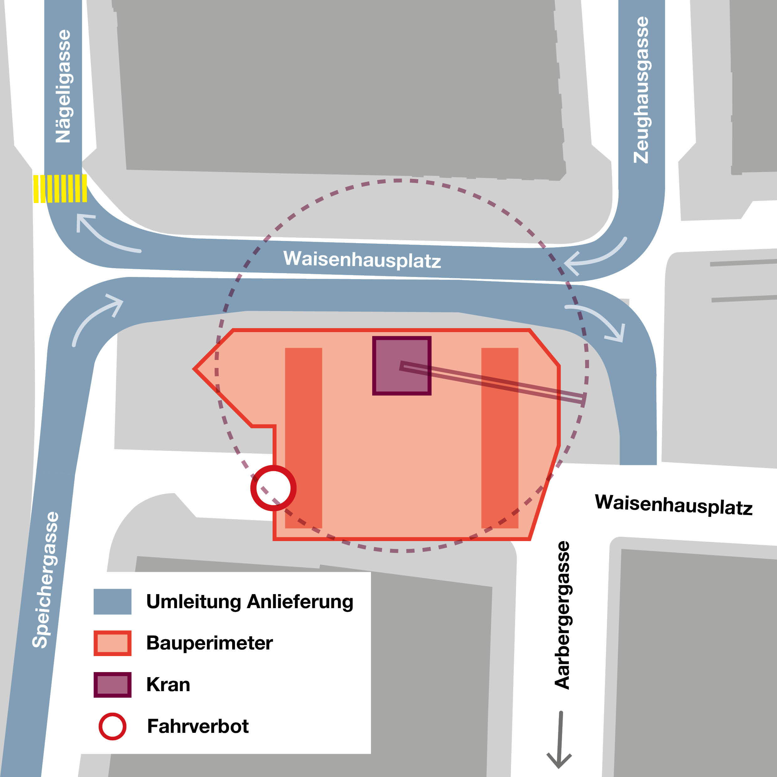 Die Wegfahrt Zeughausgasse über Waisenhausplatz ist verändert. Die restlichen Anlieferungsmöglichkeiten bleiben unverändert.
