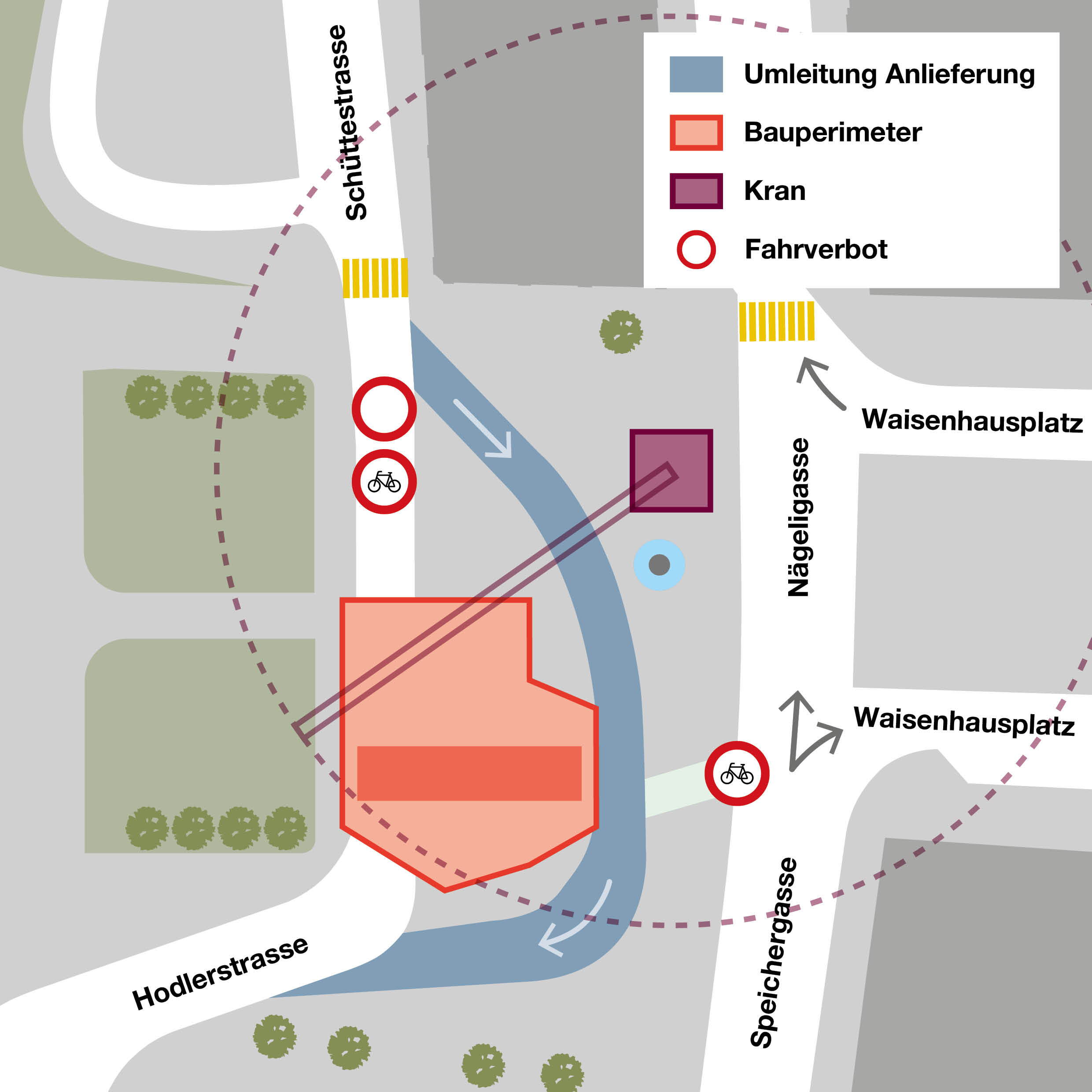 Das Queren im Bereich Meret-Oppenheim-Brunnen ist eingeschränkt.
